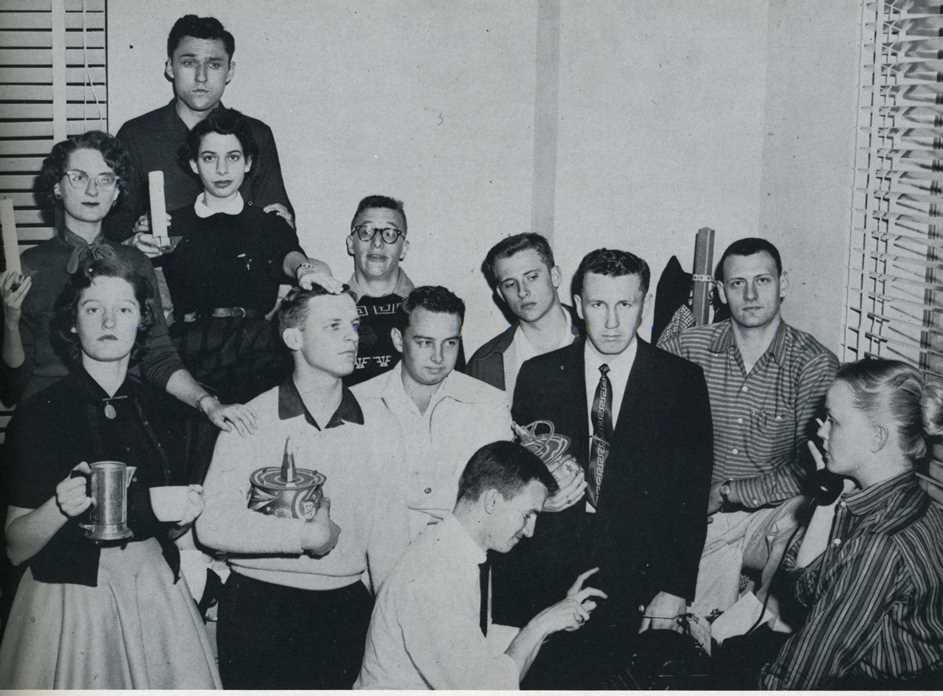 The caption tells me this was the staff of the 1955 Ranger. Journalists, I presume. Yearbook staff. But it doesn’t explain why a young Jay Leno looks so somber at the top, or why staff members are holding items on display, while laying hands on each other. Or why the fellow in the glasses looks like former SNL alumnus Andy Samberg doing his best Jerry Lewis impression.
