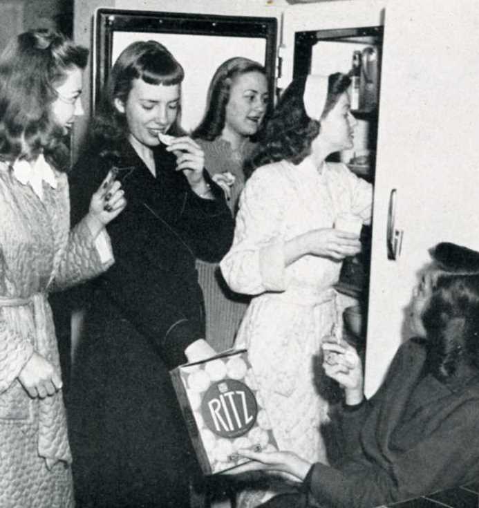 1. Not even done with Ritz one, she dives in for Ritz two. “You crackers me up,” says best friend on the left. Box holder has more of a thing for the gal going into the closet, though, Kerbey. There’s so much going on in this one little ol’ yearbook candid.