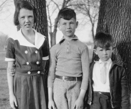 Do you recognize the middle boy, flanked by siblings Catherine and Dick in the 1930s? Former magician, DeLorean investor, proficient drummer, and lover of Wint O Green Life Savers–are you getting warmer? How about Nebraska-raised?
