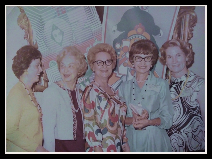 1. Things that interest me in this one: (i) wondering what occasion brought them together for the photo, (ii) the cheer and simple elegance displayed by each, especially the lady in the light turquoise dress, who seems slightly dressier than the others, (iii) the print dresses and the glasses, (iv) each lady is wearing a beaded necklace, three of which are near identical, and (v) the Latin-colored Peter Max-style painting or image behind them.