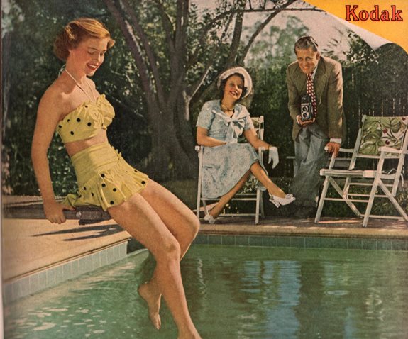 Well, what do have we here? It seems as though Mom and Dad have just returned from Sunday services, and Margie (who surely attended as well) quickly changed into … why, YES, it IS a teenie, weenie, yellow polka-dot bikini (the song actually came out 10 years after this picture) and is testing the pool water. But doesn’t it seem odd that Dad hasn’t at least loosened his tie since returning home? Mom didn’t pause to take her gloves off and set them on the counter? It’s such a strange juxtaposition. Can’t her parents swim? Dad is either so full of pride at the amazing back dive Margie has in store or he’s stabilizing himself from holding that heavy camera. Come on, Margie! You can do it!