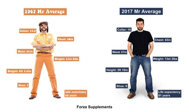 The UK also struggles with obesity. They posted this image, comparing a typical 1967 male with a modern man. The difference was 23 lbs.