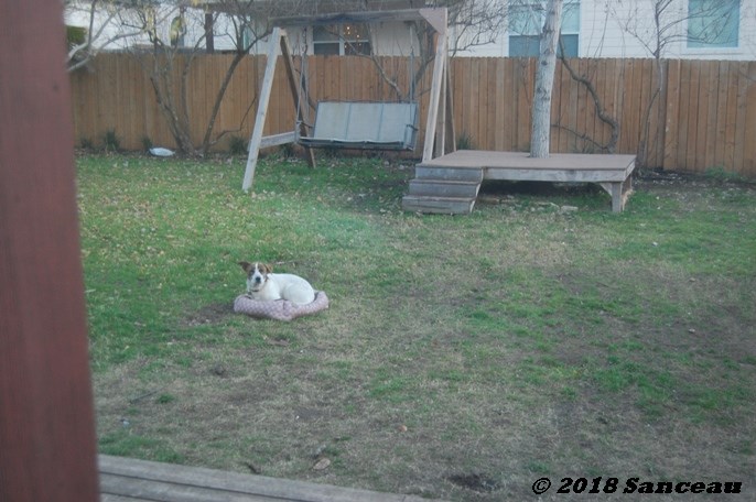 Lest you find her bed too diminutive, be aware that she chewed her dog bed up, and has now procured the bed of Tonto, our senior heeler/basset. During a water break, the wind flipped her bed over, and she decided to nest on the blue flamingo cushioned chairs instead.