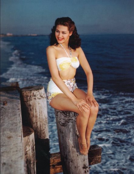 Still need something more eye-catching in your swimwear? How about ruched gold lame? It slims protrusive abdomens and instantly makes any woman look 20 years older. Case in point: here we have Carolyn Jones (aka Morticia Addams) posed aboard a ship railing, looking much older than her 31 years. It brings to mind an image of one’s randy aunt, having escaped her Carnival cruise cabin, full of gin, and ready to mingle.
