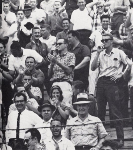 Perhaps it’s the combination of shades and smokes that makes these fellows look too cool for school–too cool to jump up and down anyway. Methinks they don’t want to look overly enthusiastic and wind up looking like Mr. Plaid down below, who appears to be uneasy in applause. Perhaps he has tender palms?