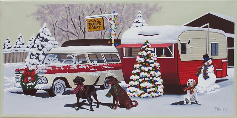 I’ve never lived in a trailer court or hauled a camper or driven inside a 50s car, or even seen more than three inches of snow in my life. So perhaps that’s the appeal here to me. It all looks so campy and fun! I may not ever build a real snowman before I get to heaven, so I’ll enjoy the pictures instead.