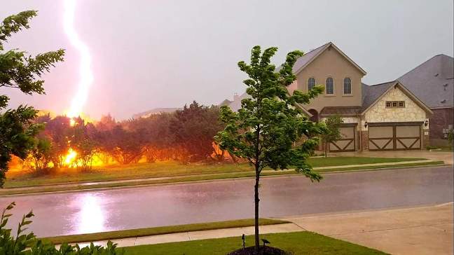 One, from a very brief but harrowing storm with 80 mph winds, which caused this strike of lightning right beside a friend of mine’s home. (The rain quickly doused it.)