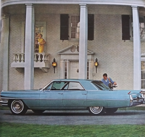 So much in this one tiny image. The slender woman at the balcony, trying to fill the emptiness of her husband’s neglect with six ounces of Earl Grey, as he obliviously tries to pack away his clubs into a luxuriously long and lean baby blue ’64 Cadillac. Note the fender skirt. Have you ever driven a car with a fender skirt? Has the term changed because a skirt implies gender, though cars are often thought of as female? Can I call this a house of antebellum architecture? Or is that passé, now that Lady Antebellum has become Lady A, due to the fact that columns = slavery = plantations = racism? Better take Lincoln off the penny, as he denotes STRONG connotations of the Civil War, and we shan’t want to be reminded of that baser time. In fact, weren’t ALL times baser? Do not we become more woke and woke each day? At least, we all have the right to vote these days, but what of Yellow Dress up there? How can she get to the polling booths if Stan is taking the car? There was no mail-in in 1964. LBJ beat Goldwater that year, but perhaps his victory lies in part, due to all the housewives who simply could not make it to the booths that year, due to their golf-happy spouse’s Tuesday game. Makes you wonder.