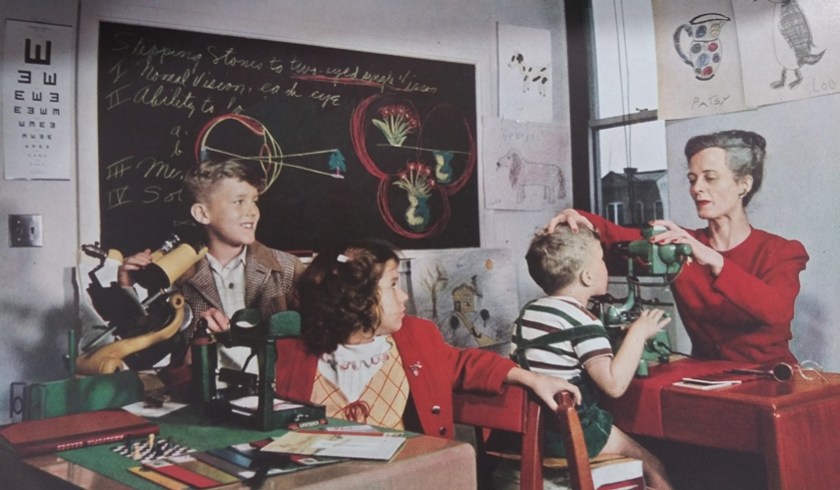 1. I had to use a contraption like that for my ‘lazy eye’ when I was about that kid’s age, Kerbey. Then they made me wear a patch over my ‘good eye.’ I think I still have bruises from walking into stuff. An operation cured the muscle problem (though I can get slightly crossed if I get tired or drink one too many is a thought I carry with me) but as for curing vision, no, in that one eye I still can’t go more than the big E on the chart even with glasses. There you have it.