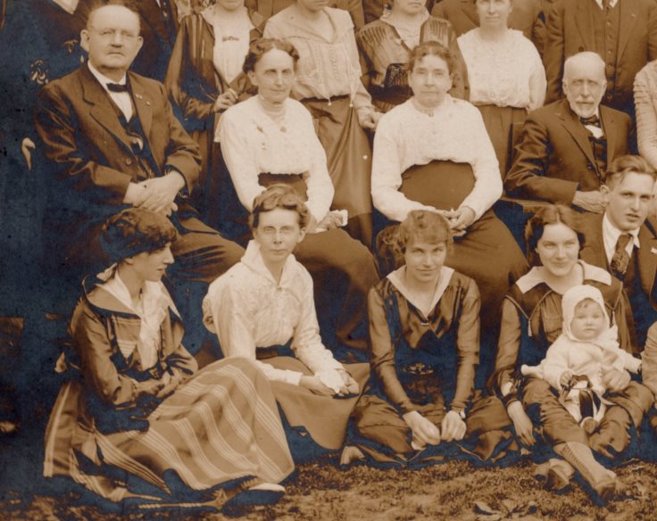 Those eyes prove these two are related. Probably sisters–sandwiched between a stern mother and a less terrifying sister. Clasped hands, similar necklaces, and those eyes that stare up and out with…what? Mischief? Sorcery?