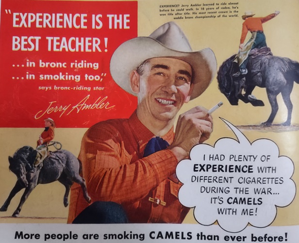 You’ve probably never heard the name, Jerry Ambler. As you can see in this 1947 ad, he was a bronc-riding star, winning the North American Saddle Bronc title in 1941 and 1946. Born in Alberta, Canada, Ambler became the best of the best. The Canadian Pro Rodeo Hall of Fame Jerry’s asserts that his greatest achievement came in 1946 when he was declared the World’s Champion Saddle Bronc Rider. Though the ad seems to imply his experience with off brand smokes was during service in WWII, I find no record of military service, only rodeo competitions. Perhaps simply the rationing of cigarettes was enough to make him long for Camels.
