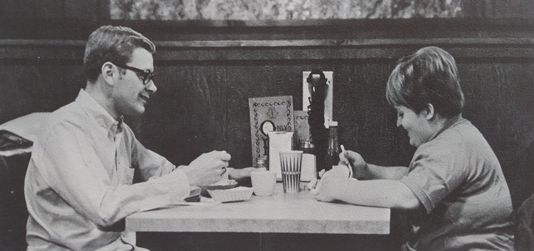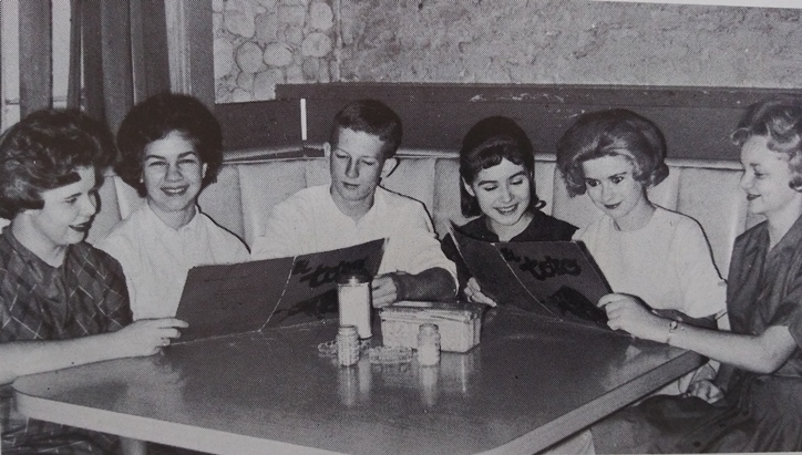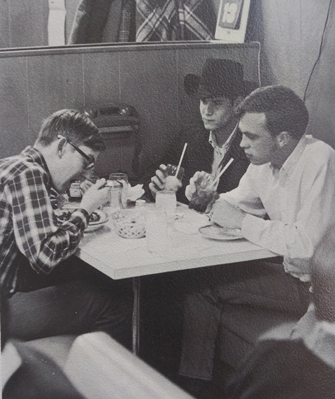 These fellows presumably were denied the scrawled ambience of the former picture, but instead had a tableside jukebox. Or its it a phone? I can hardly tell.