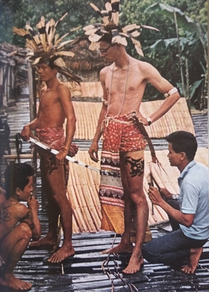 Ed Price, the person of nominally lighter color, volunteers in ceremonial dress while a Sarawak gives him a temporary sample of sea dyak tattoos, tribal art from Borneo. What do you think? Too much?