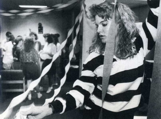 Discounting the obvious crimes of hair and use of cigarettes (and LENGTH of cigarettes; you’ve come a long, long, LONG way, baby), and plaid vest that somehow makes her more street than lumberjack, or even simply the use of THIS as their Christmas card, what bothers me most is those blinds. I remember those blinds in my first years of apartment dwelling. The way they never moved in synchronicity like Venetian blinds or their superior window cousin, plantation shutters. Just try and pull them to the side. You can already hear the swishing and slamming of cheap plastic blind crashing into cheap plastic blind. Erratic! Random!