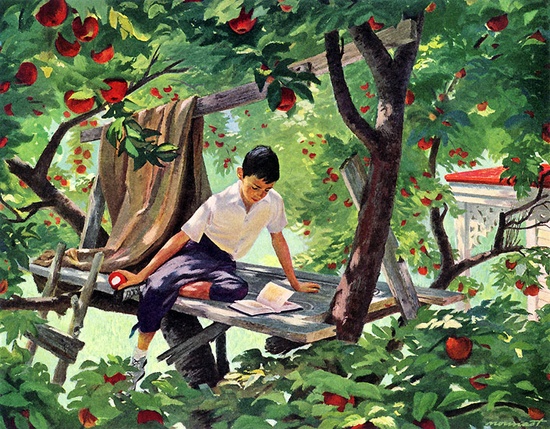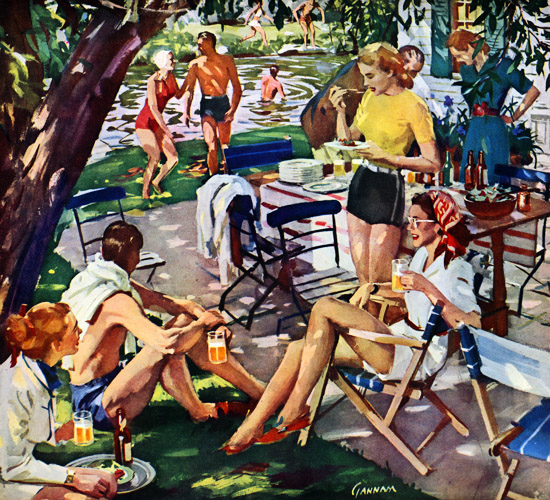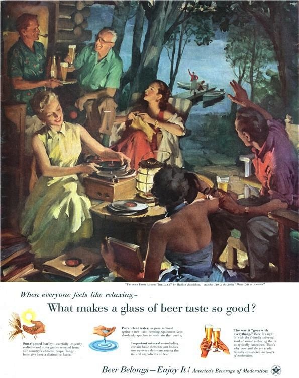 Keep in mind that this was 1948, so everyone was thin. And yes, everyone was fairskinned, so not every token ethnicity is represented, the way they are sprinkled in to department store ads in current acceptable proportion these days. Just get past that, you PC freaks. The focus here is on the technique. This is ART. You an keep your abstracts; I’ll take mine uplifting like this. A sunny day, a refreshing creek (clearly without water moccasins), stylish kerchiefs, Betty Grable legs, snacks at the ready… Who wouldn’t want this life? Even the most devout teetotaler is not immune to those Tang-tinted mugs o’ ale.