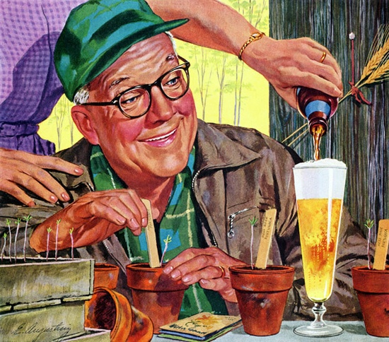 I believe this depiction represents the best of both worlds, Hannah Montana. Gardening is getting done AND beer is being enjoyed. He has his own glass; she has hers. The weather is lovely. He’s pensive; is that a mortgage bill in his hand? Who cares? With argyle socks and a butterfly apron, you can never go wrong.