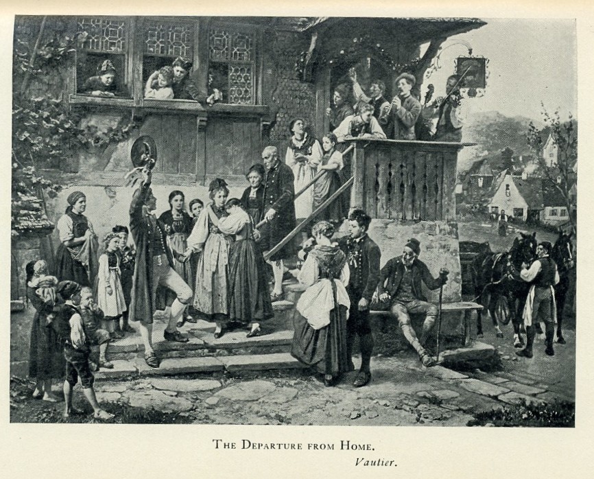 Pardon me, but why are there old people at her home? Why is that septuagenarian helping the bride disrobe in front of her grandpa? Children at bay windows are witnessing this! Gossip is being told to Teddy Roosevelt. Men lifting suitcases on the staircase should mind their own business. Truth be told, the departure from home seems much more lively. Perhaps she should continue departing.