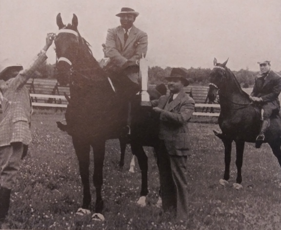 A silver cup and blue ribbon were presented to Mr. White (Edward White), a Chicago paper dealer, astride his five-gaited saddle horse, Rex Chief.