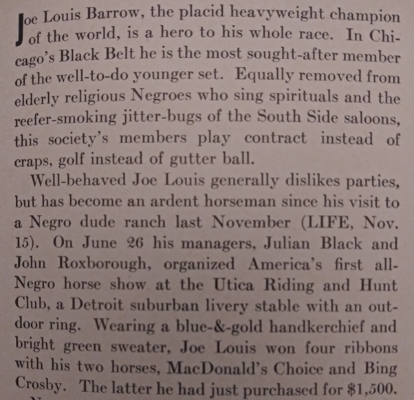 Bing Crosby seems an odd name for a choice, no? I think we can all infer the condescending tone of this article, which seems to be patting Joe on the back for his civilized behavior and shall we say, refined, hobbies. Third prize went to his gelding, MacDonald’s Choice.