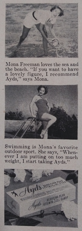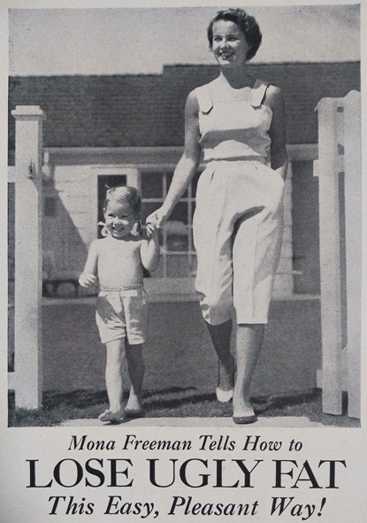 Mona, that’s all well and good, but before you get to the weight loss secret, please explain why your child appears to be both barefoot and topless in a nationwide ad-VERR-tiz-mint. Surely a Hollywood A-lister such as yourself could spring for a blouse and sandals, unless you spent all your money on Ayds.