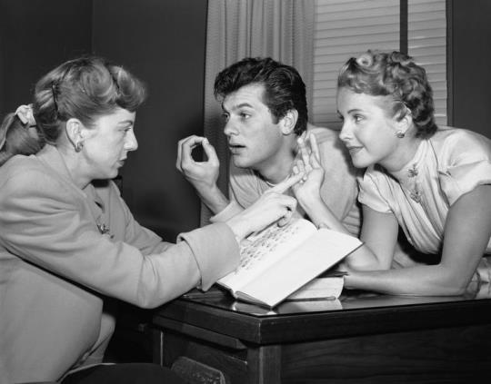 Now, see here, we’d usually end this post at this point. But I fear you’ll go Googling Ms. Freeman, and you might wind up at WikiFeet by accident, as I did, a site for freaks who enjoy celebrity feet. So to spare you such heathenism, I’ll share this shot of Mona and Tony Curtis learning sign language on the set of the movie “Flesh and Fury,” wherein Curtis played a deaf-mute prizefighter.