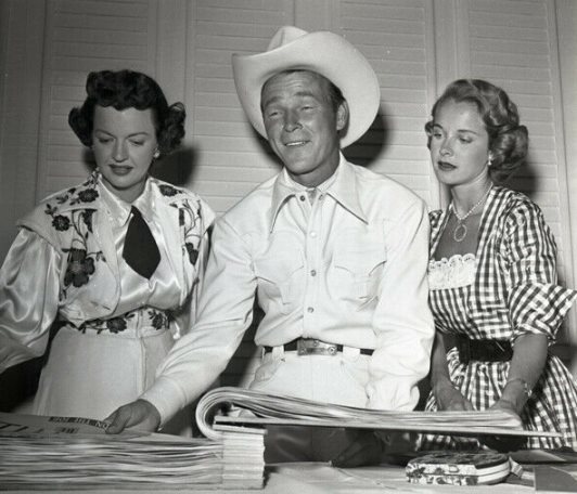 And here she is with Roy and Dale, wearing a belted gingham dress that shows off her Ayds waist.