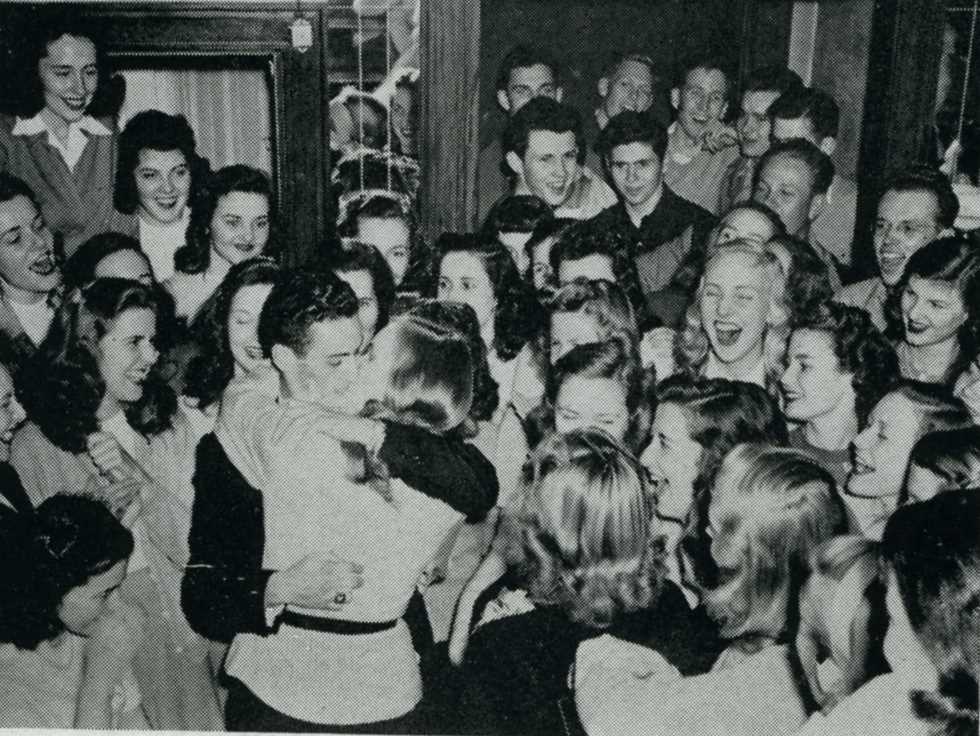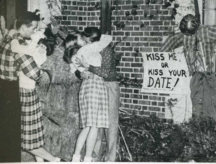 Was this the designated kissing spot? Out in plain view, for all the world to see? There must have been some mistletoe in the vicinity. Actually, this couple was getting “officially pinned.”