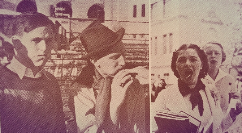 On the right, we see Charles Umlauf, Professor of Life Drawing and Sculpture, during his first year of teaching at the University of Texas. While you may not be familiar with his name, chances are you have heard of one of his art major students, Farrah Fawcett, who called Umlauf her “favorite professor.” Understandably, she posed for him as a muse, as well as sculpted on her own. Here they are in his studio, during a very stripey 1971.