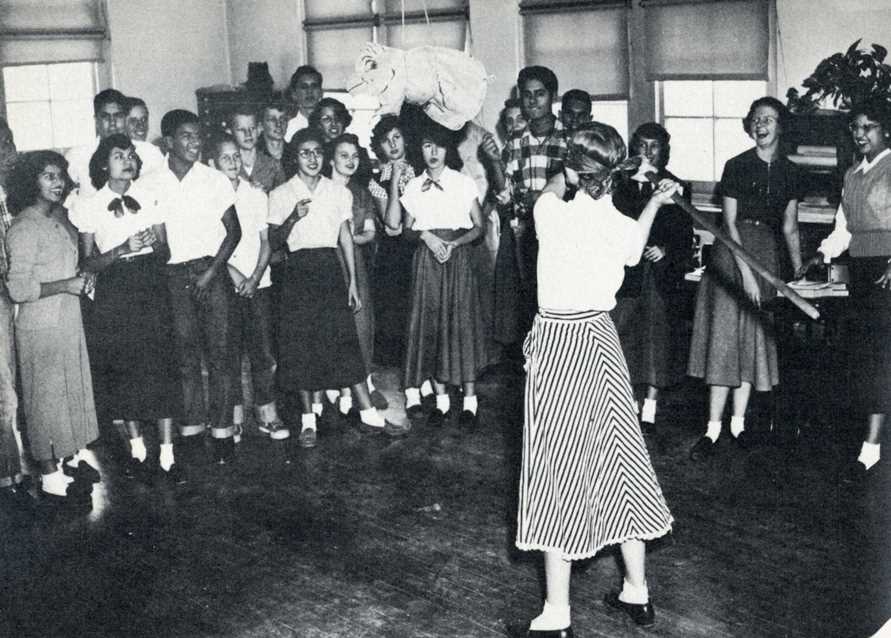 Once the batons were lightened and balanced, the weaker sex could finally lift them into the air with her small muscles. Short skirts and high-stepping routines assured that males would watch as they pranced. These guys don’t seem to mind the view.