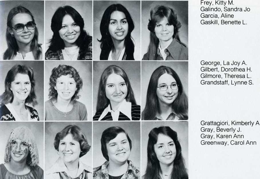 Then we have the skipper, whose eyes are shut, holding some sort of stuffed animal, a girl with a violin, a girl with a tennis racket, a girl with a GOLDFISH BOWL and a shirt that reads “Jesus” where the Pepsi logo should be. We make our way back with the wallflower, the trio of alcoholics, your nobody (she called today), the one in the unfortunate circus pants, the two Jan Bradies (prone to suffering from the Jan Brady Effect), and the girl in the classic mannequin head with a shag hairdo on a platter pose. It never gets old. Speaking of the two Jans, chances were high that one of these girls was actually named Janet or Janice, which ranked high during their birth year.