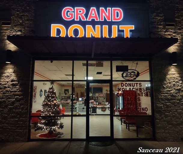 The local donut shop closes at 1pm, but I thought it looked especially cozy last night, as we drove by, with the lit Christmas tree in the window.