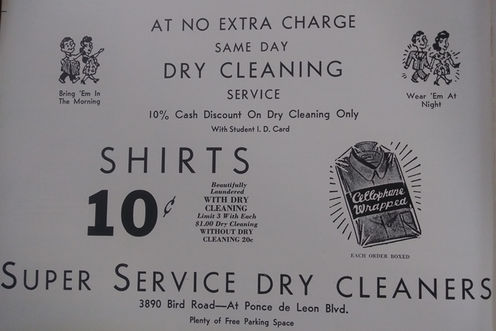 Today we take a quick look at yearbook ads in the back of my 1955 University of Miami, Coral Gables, Florida yearbook. Yes, ads might seem banal, but I enjoy the localized details, like this dry cleaning ad.