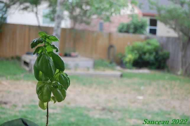 We had about 10 minutes of light rain this morning (though I’d prefer 10 days), but the basil was protected from its spot under the back porch. Growing plants is challenging in the Texas heat, so I use basil leaves sparingly. This one I mostly just smell to cheer me up.