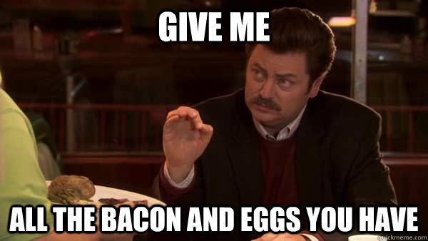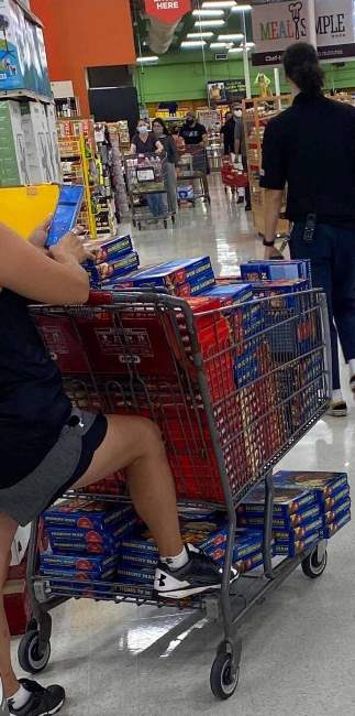 I saw this pic today of a patron in a Texas HEB and knew that I could not keep it to myself. At first, I thought someone was hoarding foil or plastic wrap. Then I realized it was Hungry-Man frozen dinners. Dozens of them, supplemented by what appear to be frozen pizzas and some Stouffers tossed in. But the core demand here was blue cartons. All of them. The entire stock. It reminds me of the Parks and Rec scene wherein Ron Swanson demands ALL of the bacon and eggs.