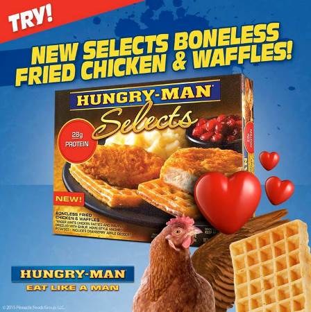 Is this a Christmas gift for a home-bound relative? Is the gift of cardiac failure and diabetes the gift that keeps on giving? I myself have never eaten Hungry-Man. So my palate never knew a salisbury steak nor a meatloaf. But who could not be tempted by this chicken caressing a waffle? Are you a man or a mouse? EAT LIKE A MAN.