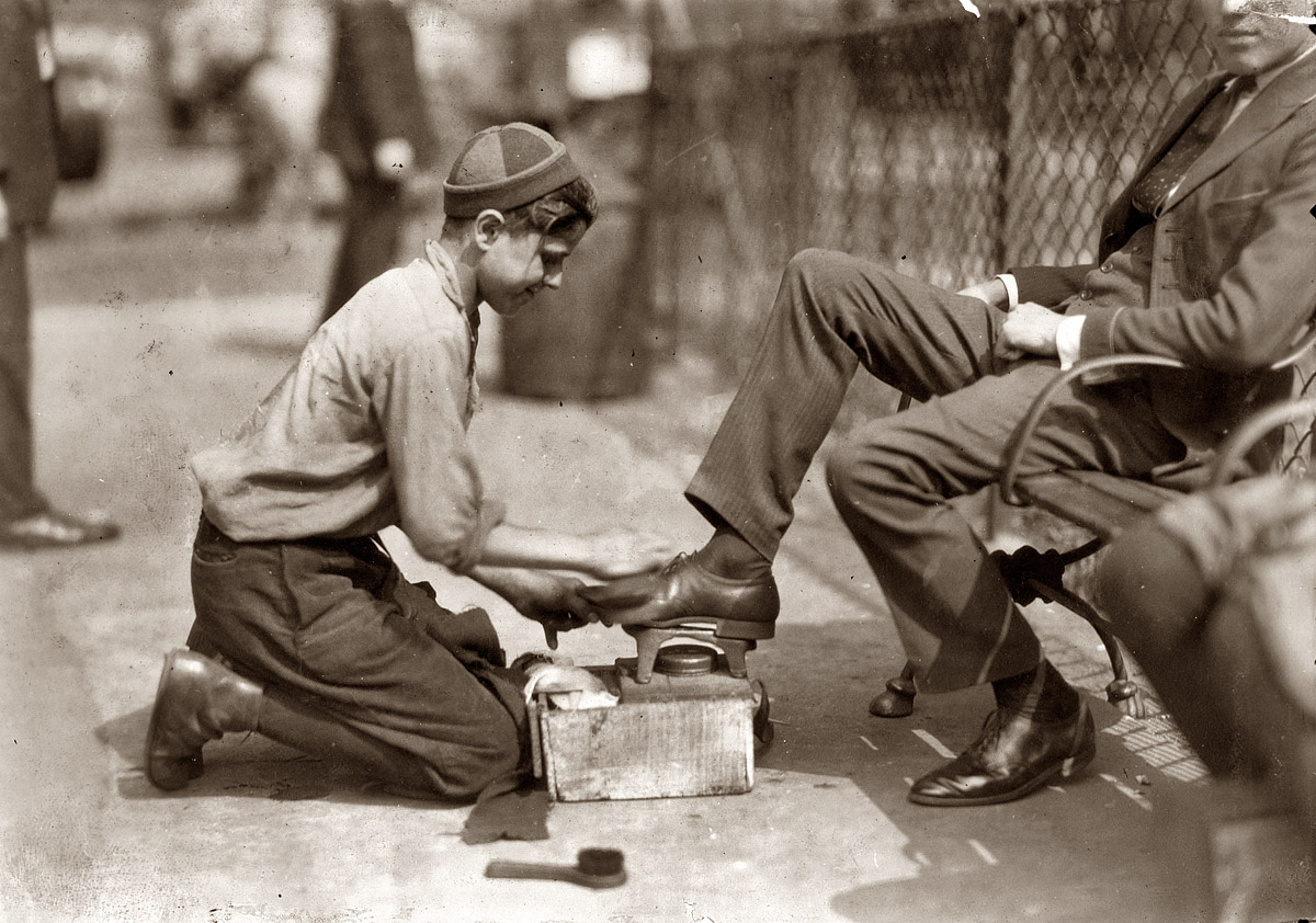 In a state full of bootwearers, I don’t recall ever having seen anyone get his shoes shined, perhaps because people have no pride in personal appearance anymore, or they have no disposable income. It must be a more urban venture. I guess it’s honest work. It seems less degrading than offering your body to a stranger for money, and some places allow that. There are better ways to earn a dollar on your knees, and bootblacking is one. In fact, ICS Learning Systems should get on this asap. It’s got to be more lucrative than TV/VCR repair.