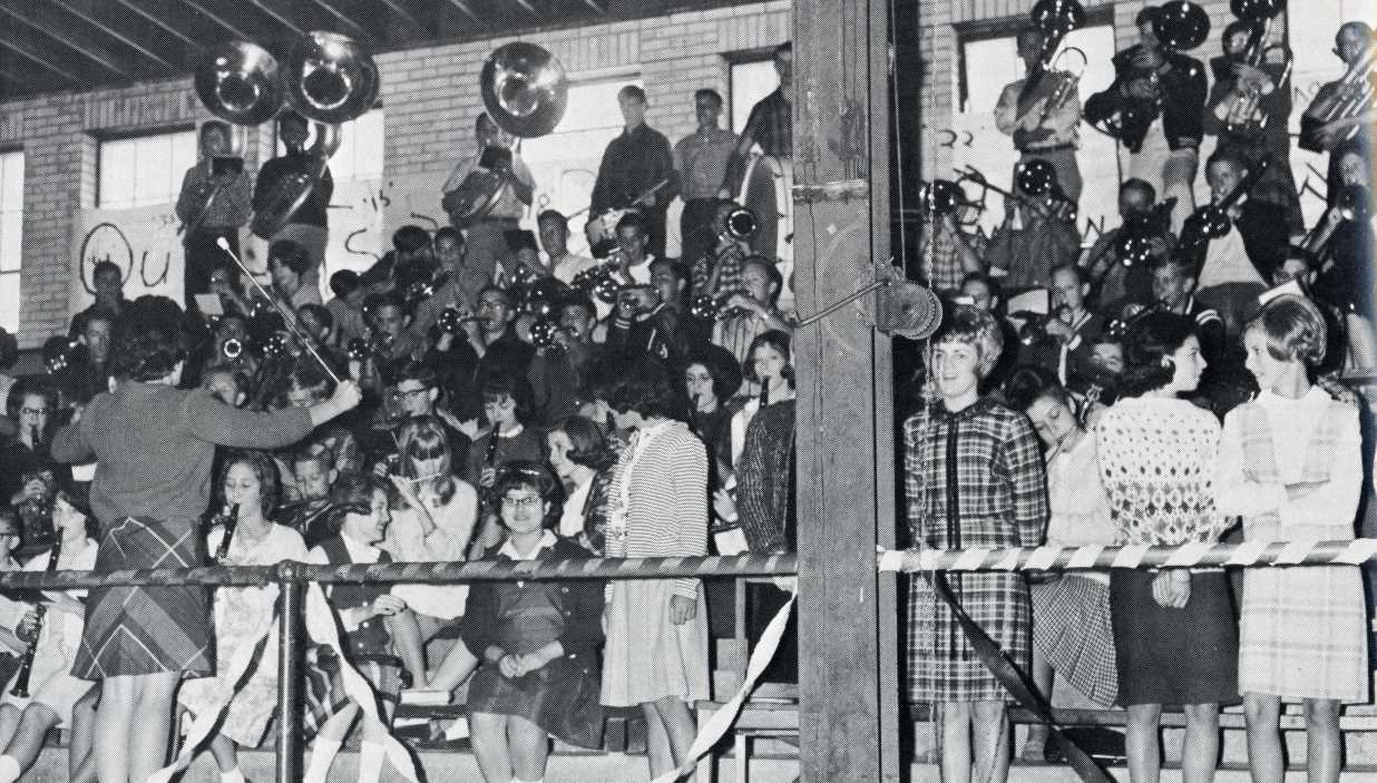 Even novices can promote school spirit! This girl appears to be conducting the band with a baton at a pep rally.