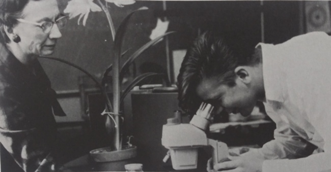 Some technology was old-school, like this microscope being used by a lad with a healthy head of Elvisian locks.
