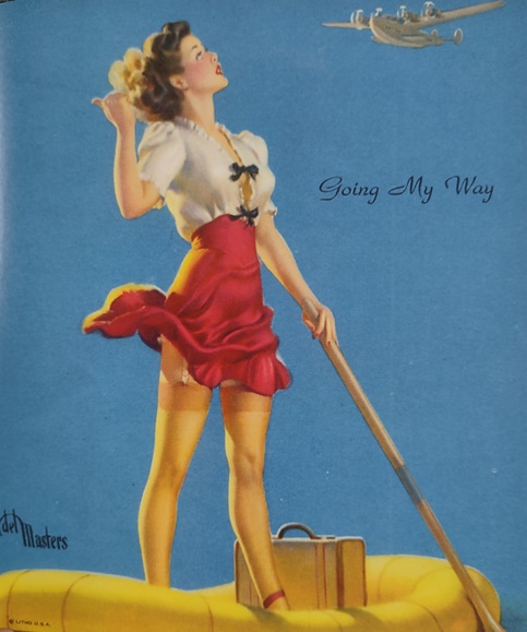 This Del Masters pinup opens itself up to many questions. Firstly, we all know that hitchhiking is frowned upon, especially once serial killers came into vogue. Who knows what kind of person might rescue her? Secondly, there is no way that seaplane could spot her thumb from so high above. Even supposing it is a seaplane that had the capability of landing Sully-style near her, the waves would topple her raft, especially if she insists on standing astride it. The last thing a pilot wants to see is a distraught young woman in a wet, white shirt.