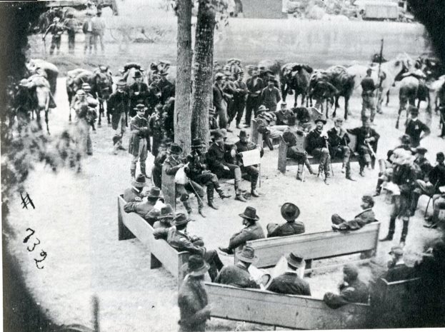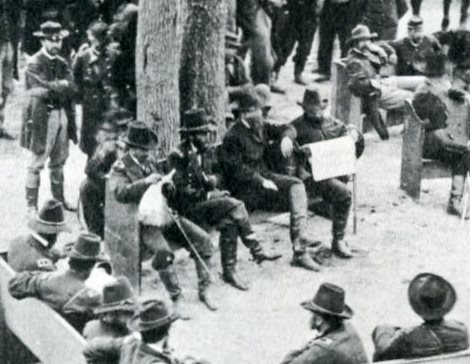 It’s June 2, 1864. Photographer Tim O’Sullivan has taken to the steeple of Bethesda Church in Virginia to capture this image of Ulysses S. Grant (between the trees), listening to a report by Colonel Bowers (reading at the far right, inside the circle). On Grant’s right is General Horace Porter (reading a newspaper), and on his left is General Rawlins, chief of staff. Here’s a closer look.