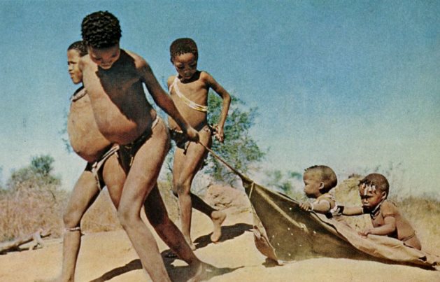 Yep, this is the classic National Geographic you know and love. Nearly naked barefoot bushmen covered in dust. And while their bellies look distended, the author asserts that is due to swaybacked posture, and neither gorging nor starving. At any rate, the toddlers seem to be enjoying the ride on a discarded cape, making due with what they had and using their imaginations to create fun. Such is life in the veld.