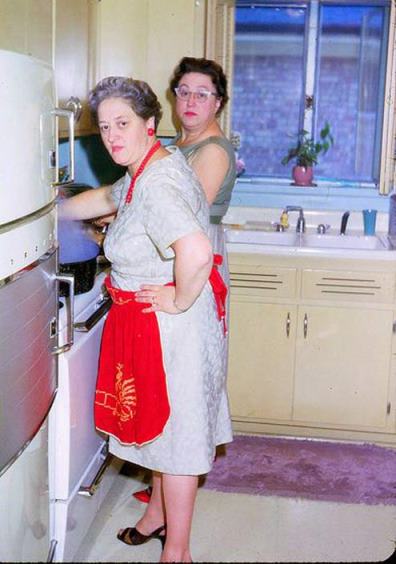 I bet these two had the neighborhood dish. And I don’t mean the purple smoke billowing up out of that pot. Check out the red accent colors and heels!