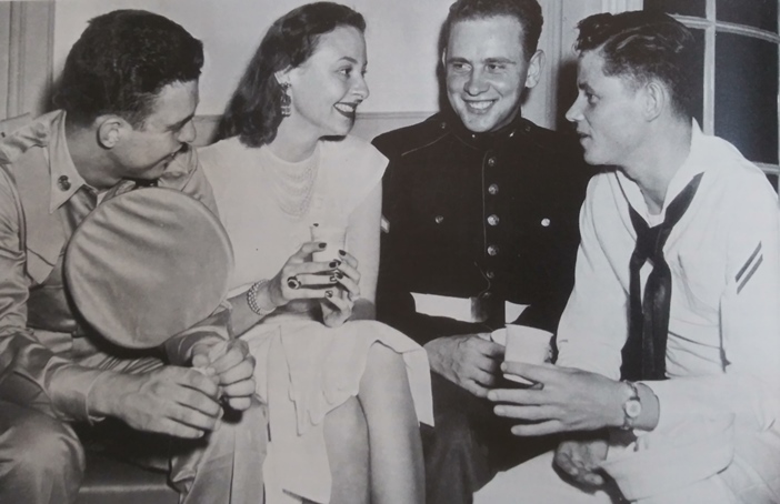 Olivia de Havilland enjoys teensy cups of beverages with different branches of WWII servicemen as part of her service in the USO.