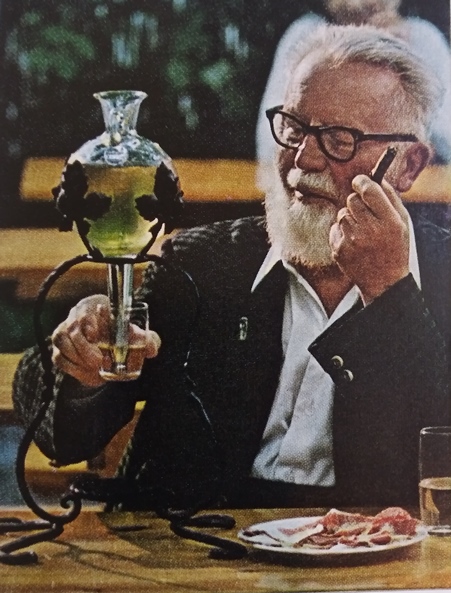 A patron of a Viennese wine garden refills his glass from a weinheber. A fat cigar, fine wine, a plate of cured meats, perhaps some friendly company. What else could one want? The article from which this came declares this image as an example of the German word, gemutlichkeit, which we’re all going to learn today.