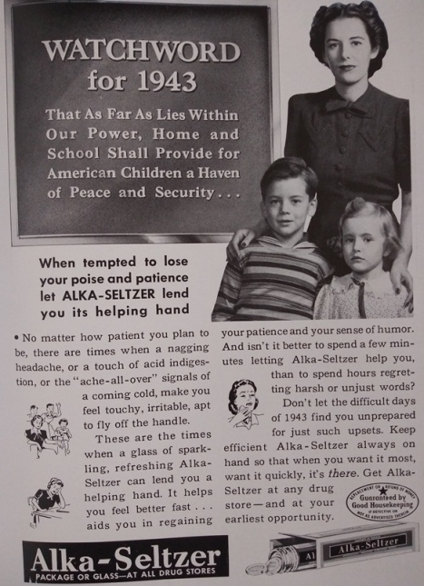 During WWII, however, moms had more at stake, fearing for their husbands overseas as well as wondering if bombs would drop on our very soil. Were they encouraged to sample pinot? Alas, no. The power of pulling it together lay in Alka-Seltzer.