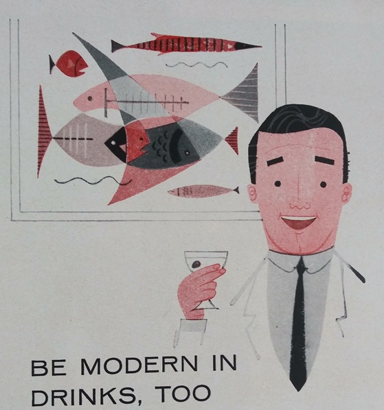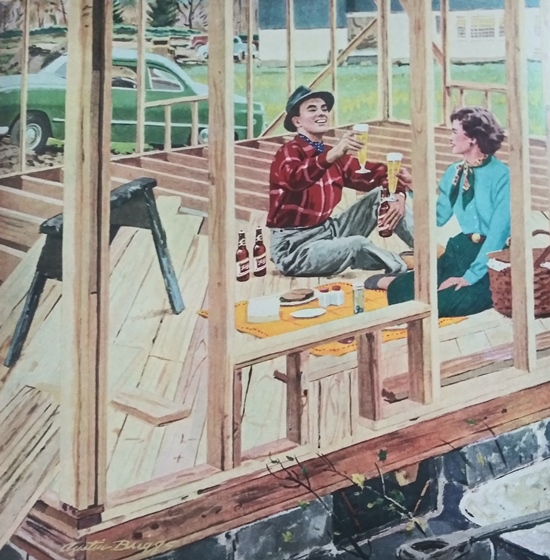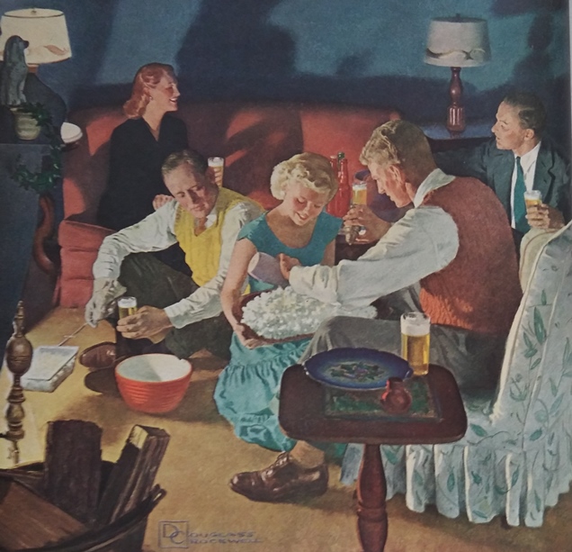 In Douglass Crockwell’s “Winter Evening At Home,” we see that Dad has just finished popping popcorn over the coals of the fire, and Mary has offered a pan of it to be salted by her beau. Everyone is enjoying a chilled glass of ale. What a fun after-dinner treat while they watch Arthur Godfrey. But what’s got Dad so forlorn? Is it because Mary is growing up so fast, and this is her last winter at home before she moves to Michigan to attend university? Is it because his right arm is sore from holding the pan off the ground, and he doesn’t have the energy to pour it into the bowl? He ought to be proud, since he clearly didn’t burn even one kernel. Quite a feat, Dad! Maybe he’s rethinking that low profile carpet and wishing they’d gone with a plush.
