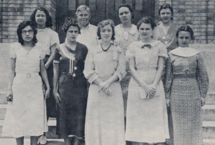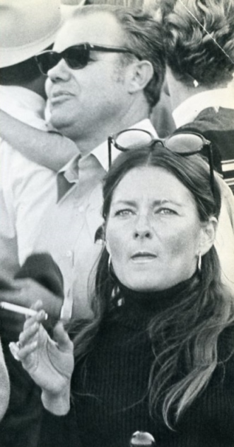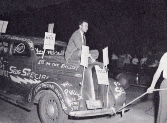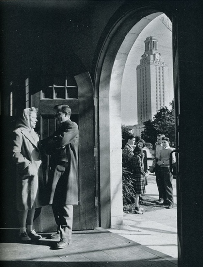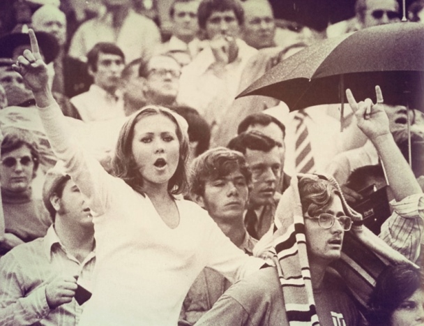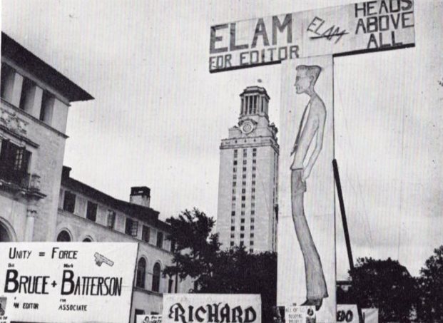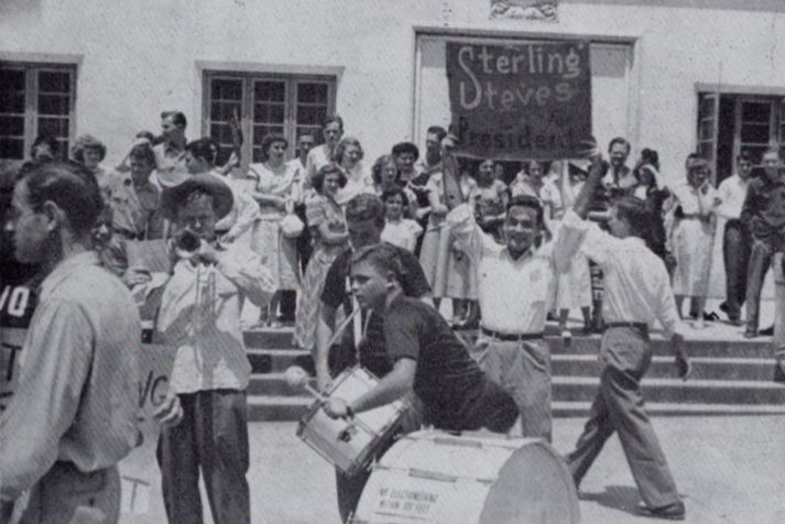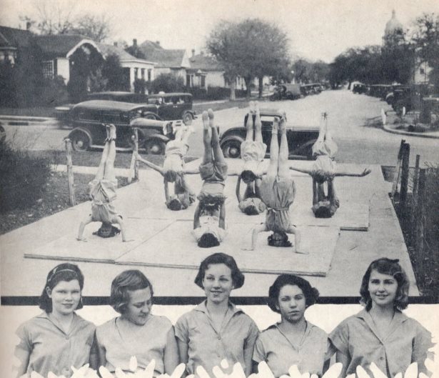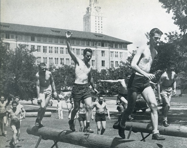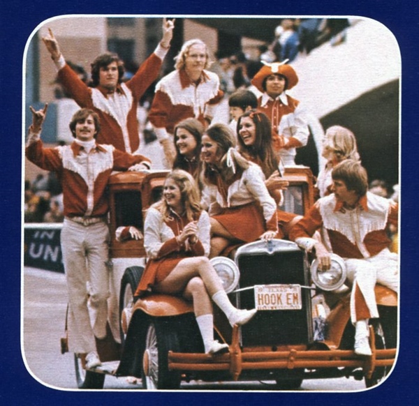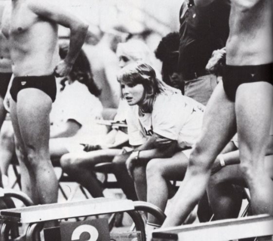 Intent on Jehovah-knows-what, Miss Radley performs one of her duties as a member of Bevo’s Babes, a group of gals who served the men’s and women’s swim team. One job was to “boost the spirit of the swimmers.” Said the secretary of Bevo’s Babes, “We don’t want the girls who just want to look at guys in Speedos.” Personally, I’ve never met a girl who enjoyed that sight in the least. But to each her own.