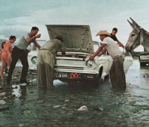 Such is the caption in this 1968 Nat Geo, as I call them. Evidently, it was a common practice for motorists to attempt to cross the Rio Grande River at its low points in fall and winter, though I would personally advise to NEVER ford a river by car. Yes, the wheels get wet, but so does the engine.