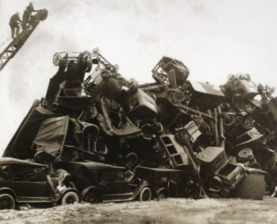 90 years ago, the US was already overrun with 40 million cars (ompare that to the 276 million registered vehicles today). Many of those were on their last leg. Chicago car dealers promoted Used Car Week by stacking jalopies nearly 50 feet high on an island in Lake Michigan, where they torched them. 100,000 folks gathered to watch the flames of 200 cars fill the air.
