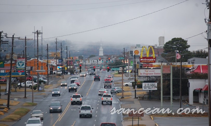 The view of downtown as we rounded a hill proved cozy and charming, white steeple hidden in the clouds.